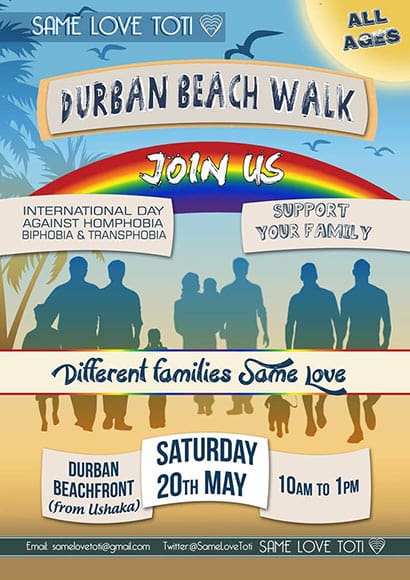 In Durban, a Beach Walk organised by the Same Love Toti Support Group will mark the International Day Against Homophobia and Transphobia (IDAHOT), which was commemorated on May 17.