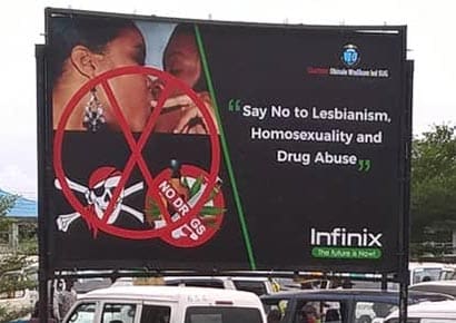 A picture of the sign was sent to Anglican LGBTI campaigner Colin Coward in the UK, who posted it on his Facebook page on Monday. The billboard appeared to have been sponsored by Infinix, a Chinese owned mobile phone manufacturer.