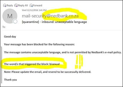Houdart received an auto response to his email, titled “[quarantine]… unacceptable language”. The message explained that his email had been blocked because it contained “unacceptable language not permitted by Nedbank’s email policy.” The message added: “The word/s that triggered the block: bisexual.”