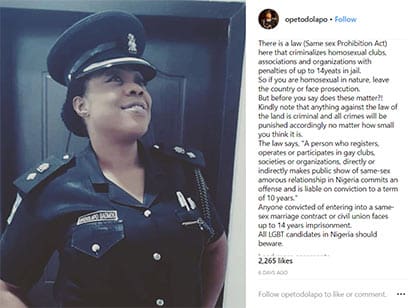Dolapo Badmos, who is the Public Relations Officer for the Zone 2 Police Command in Lagos, wrote on Instagram that, “If you are homosexually inclined, Nigeria is not a place for you.”