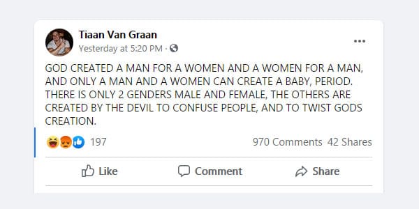 On Tuesday, Tiaan Van Graan was inspired to take to Facebook to condemn members of the LGBTIQ+ community, and not bothering to be very subtle about it.