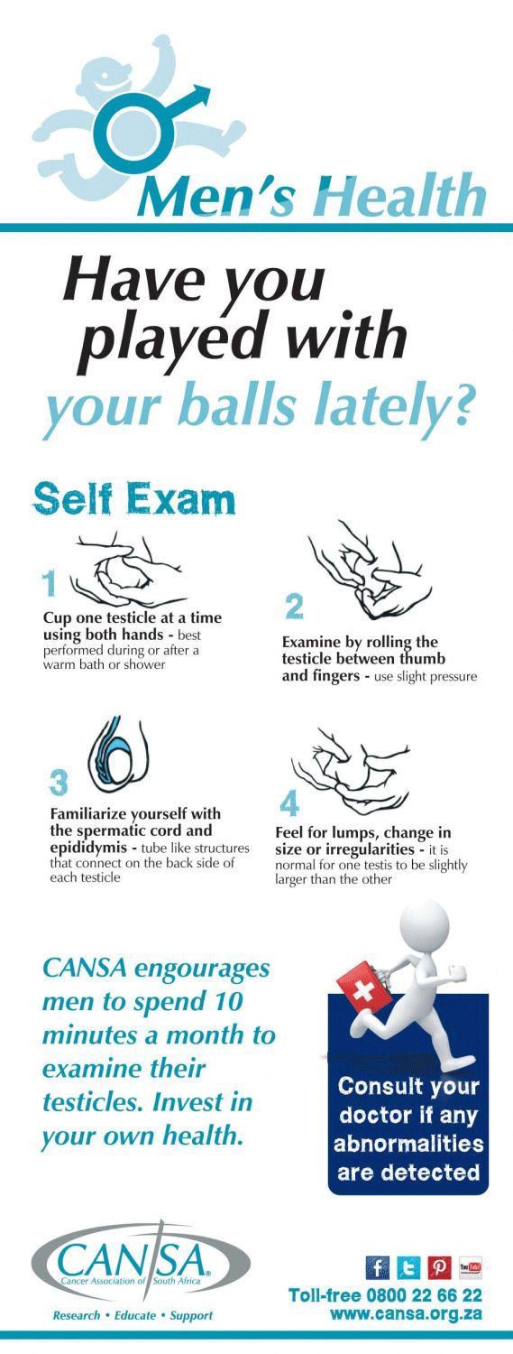 The majority of testicular cancers can be detected early. Usually, the first signs of it appear as a small lump or swelling on the testicles. The Cancer Association of South Africa (CANSA) recommends that men allocate 10 minutes a month to examine their testicles. (No, not someone else’s, yours!)