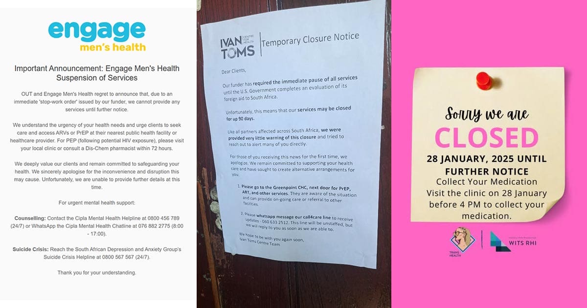 OUT’s Engage Men’s Health, which provides sexual health and mental health services in Johannesburg, Gqeberha, and East London, similarly closed its doors. A statement on its website reads: “Due to an immediate ‘stop-work order’ issued by our funder, we cannot provide any services until further notice. We deeply value our clients and remain committed to safeguarding your health. We sincerely apologise for the inconvenience and disruption this may cause. Unfortunately, we are unable to provide further details at this time.”
