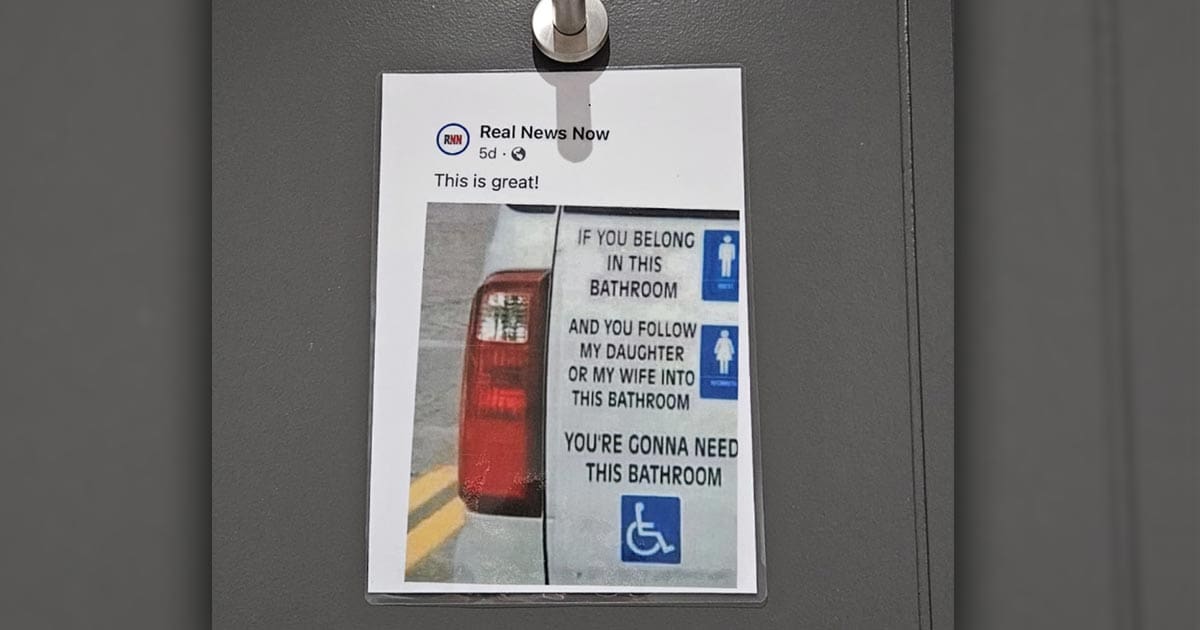 They read: “If you belong in this bathroom [male bathroom symbol] and follow my daughter or my wife into this bathroom [female bathroom symbol] you’re gonna need this bathroom [disabled bathroom symbol].”