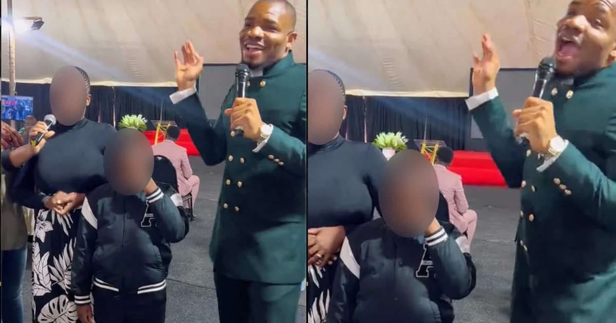 In the video, he is seen engaging with a young child in front of a congregation while mocking the child’s mannerisms and framing them as evidence of spiritual or moral corruption.