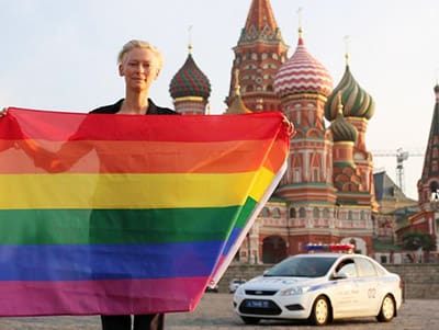 Oscar-winning actress Tilda Swinton has risked being arrested under a new anti-gay law after she unfurled a rainbow flag in front of the Kremlin in Moscow.